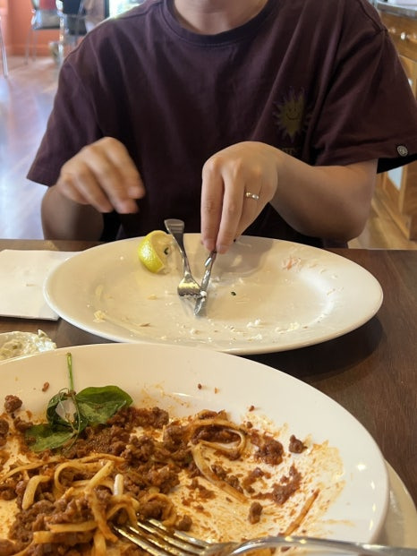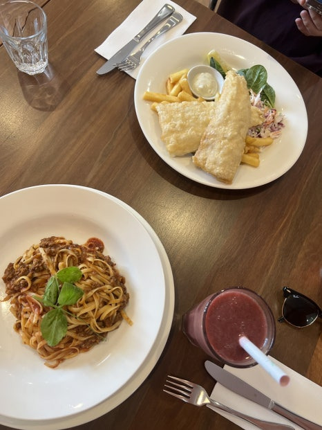 엄청난 양의 라구파스타와 피쉬앤칩스..